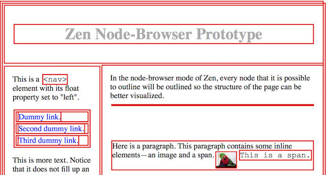 Zen will take a different approach. In Zen, HTML elements making up the web page will represent themselves at the top-level view, with all the obscurity of detail that implies, but when Zen’s node browser is open, Zen will be show a view of the web page with all borders and margins styled in such a way that, to the extent possible, all block boxes, inline boxes, and _inline-block boxes_33